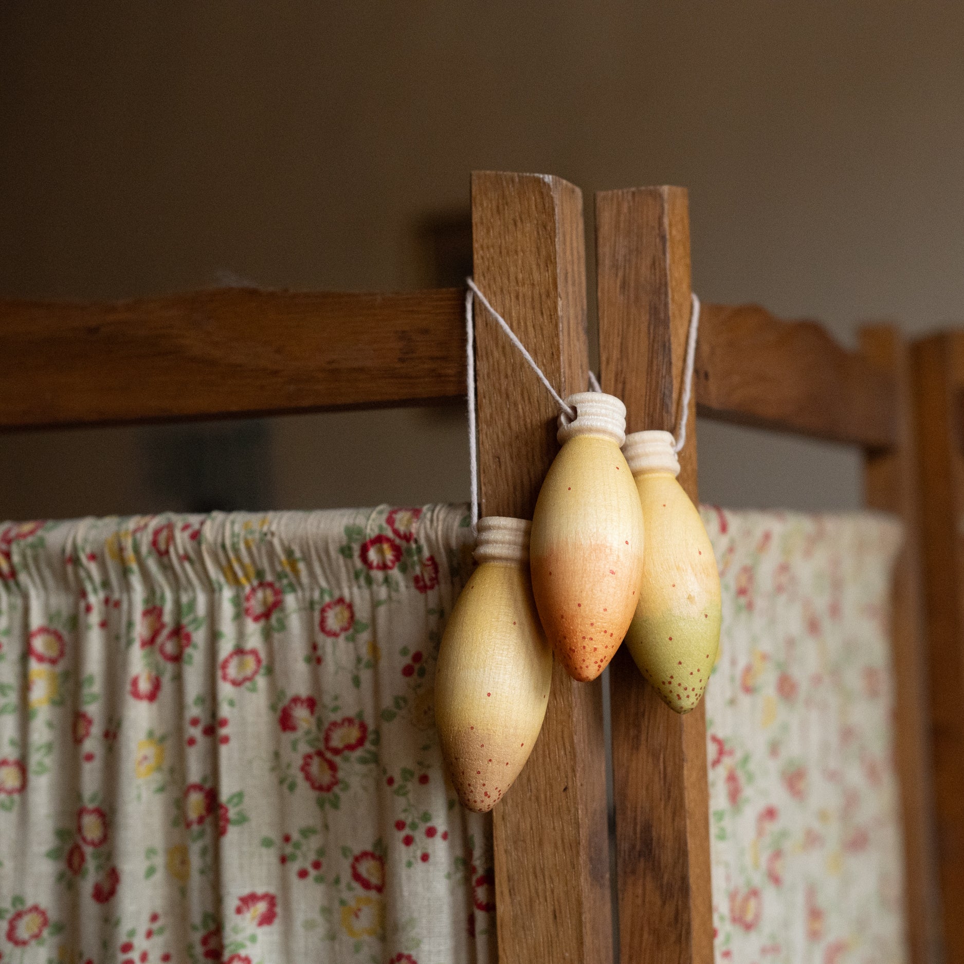- 3 drvena, ručno oslikana komada u obliku lampica s koncem za vješanje